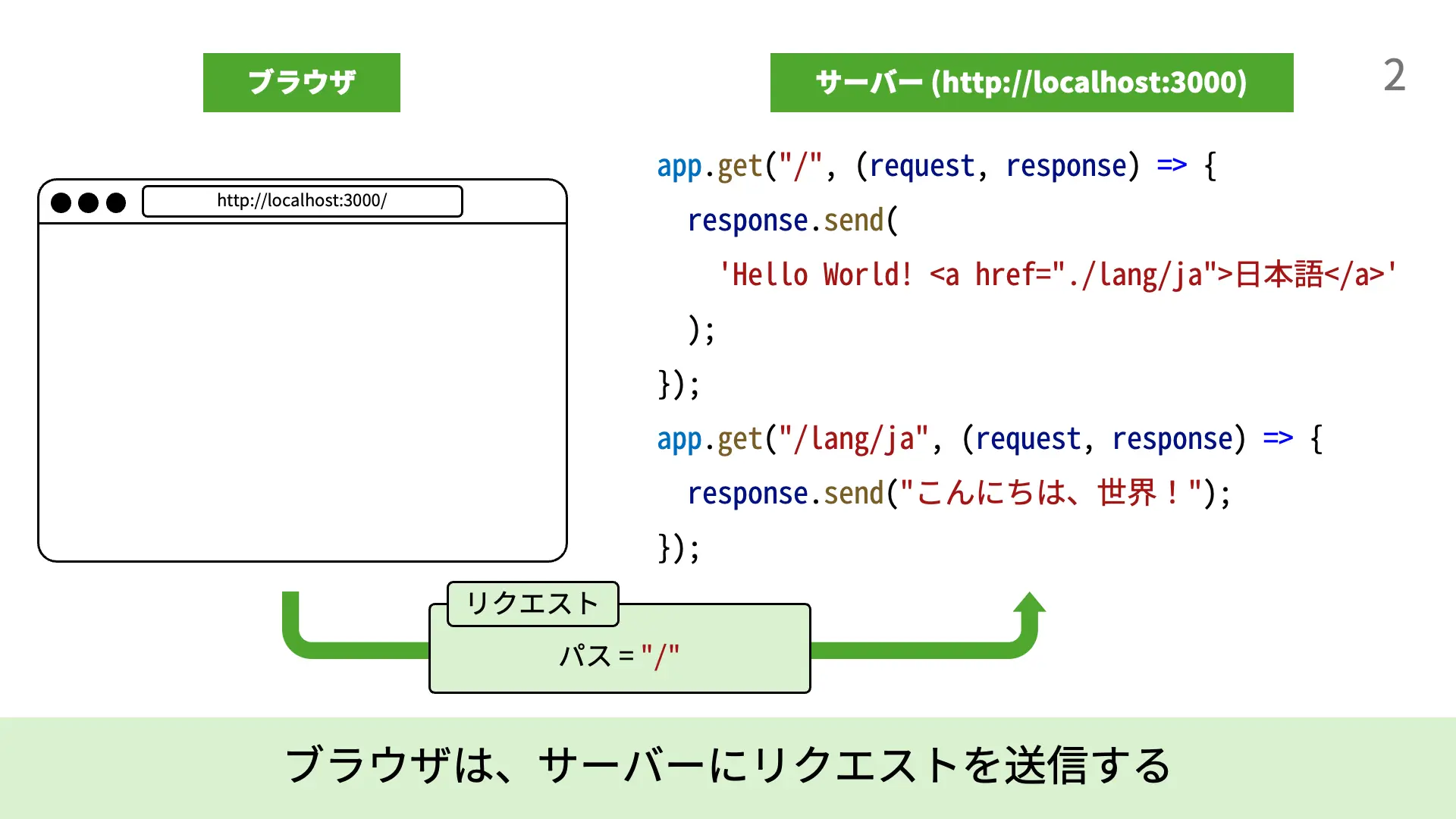 ブラウザは、アドレスバーにURLが入力されると、その情報をもとにHTTPを用いてサーバーと通信します。例えば、先ほどの例で使用したhttp://localhost:3000/lang/jaというURLは、次のように解釈されます。